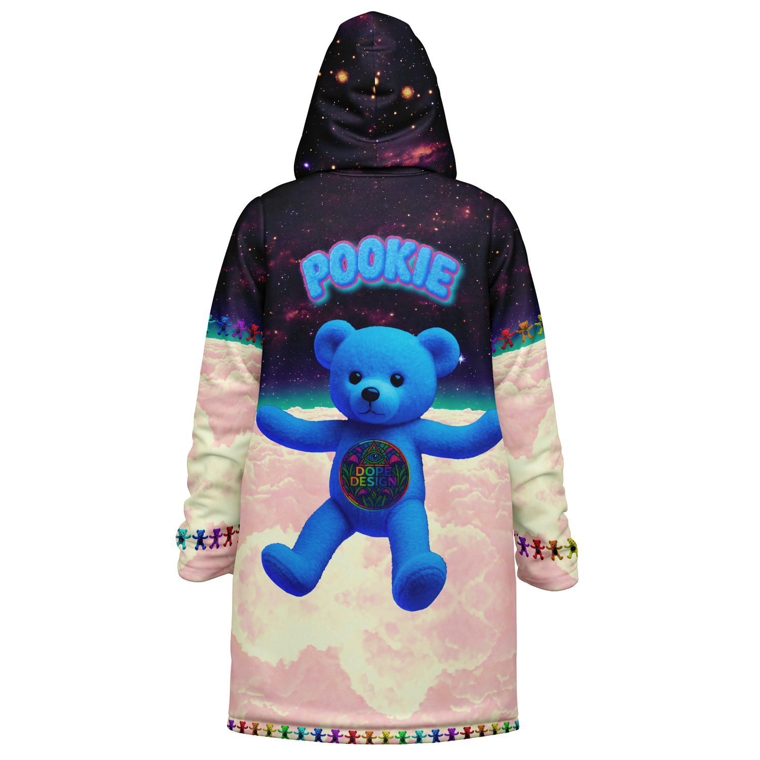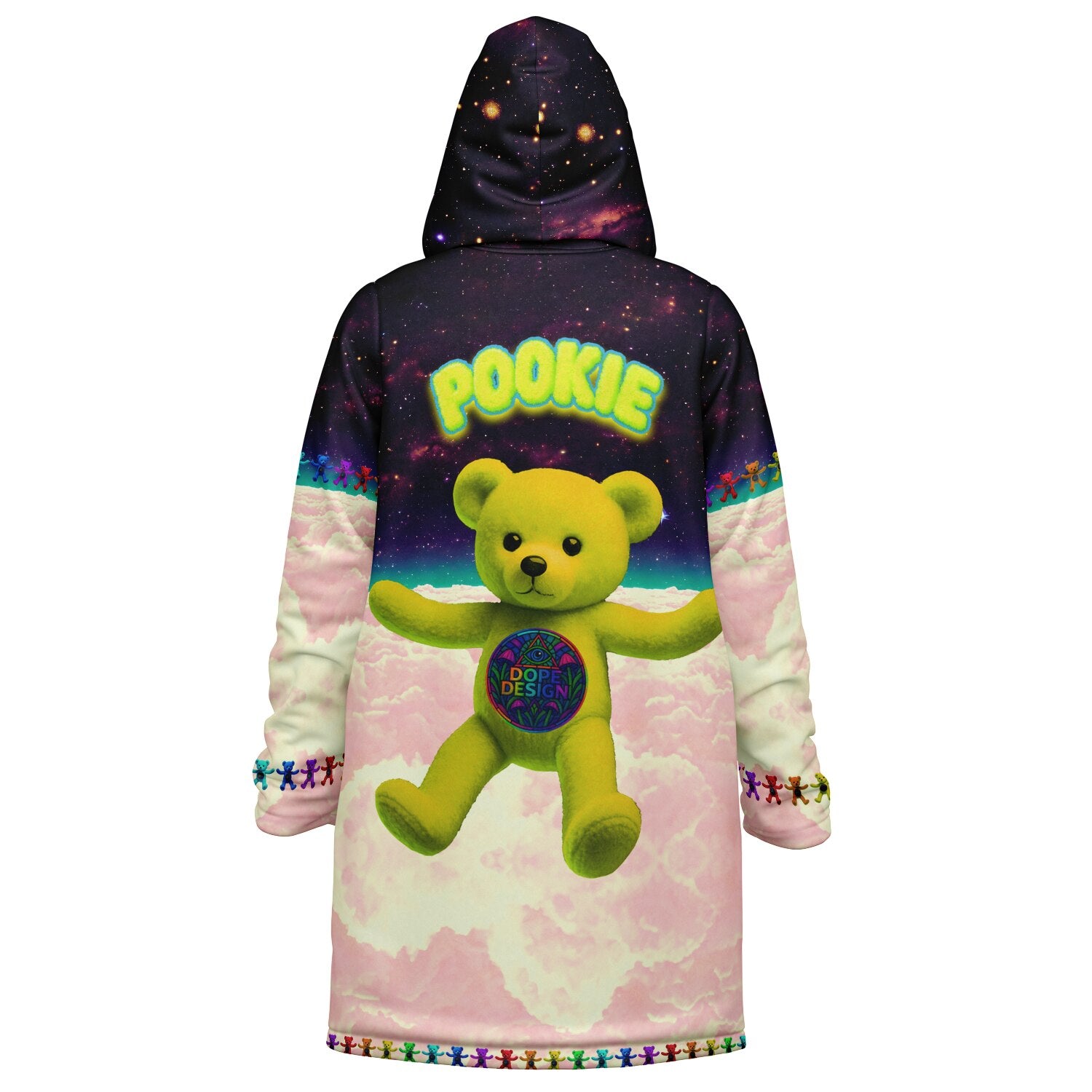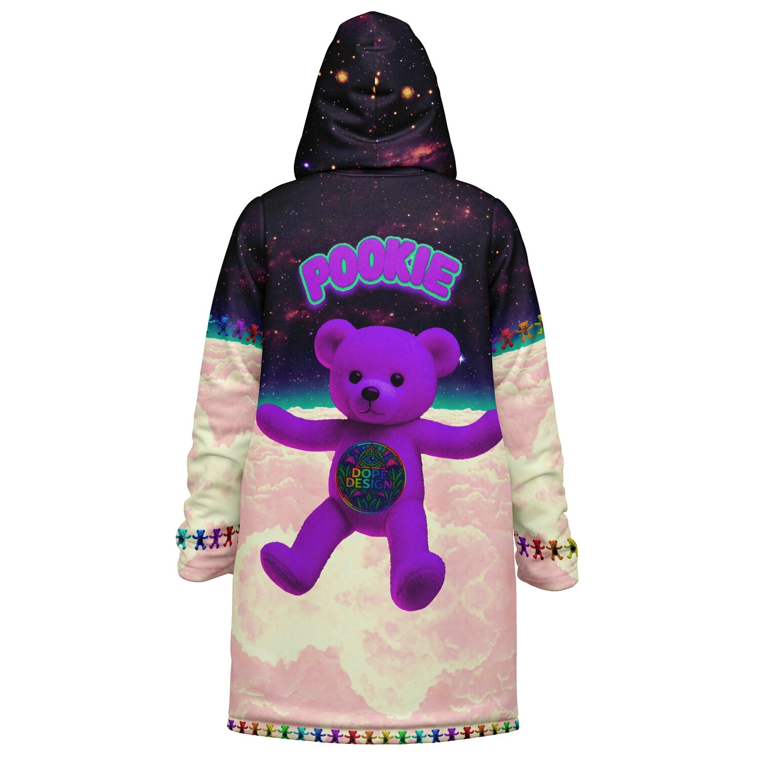 Step into a world of vibrant warmth and playful design with the Pookie Bear Cloak. This piece is a pure dose of serotonin, featuring a plush, nostalgic bear floating above candy colored clouds, encircled by a full rainbow of mini bears. The backdrop is a high definition, richly detailed galaxy that ensures this vibrant statement pops day and night with color that never fades.