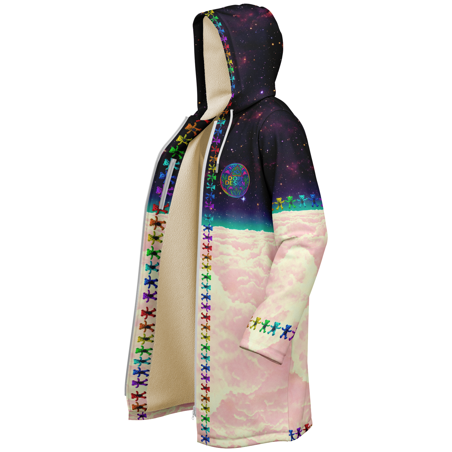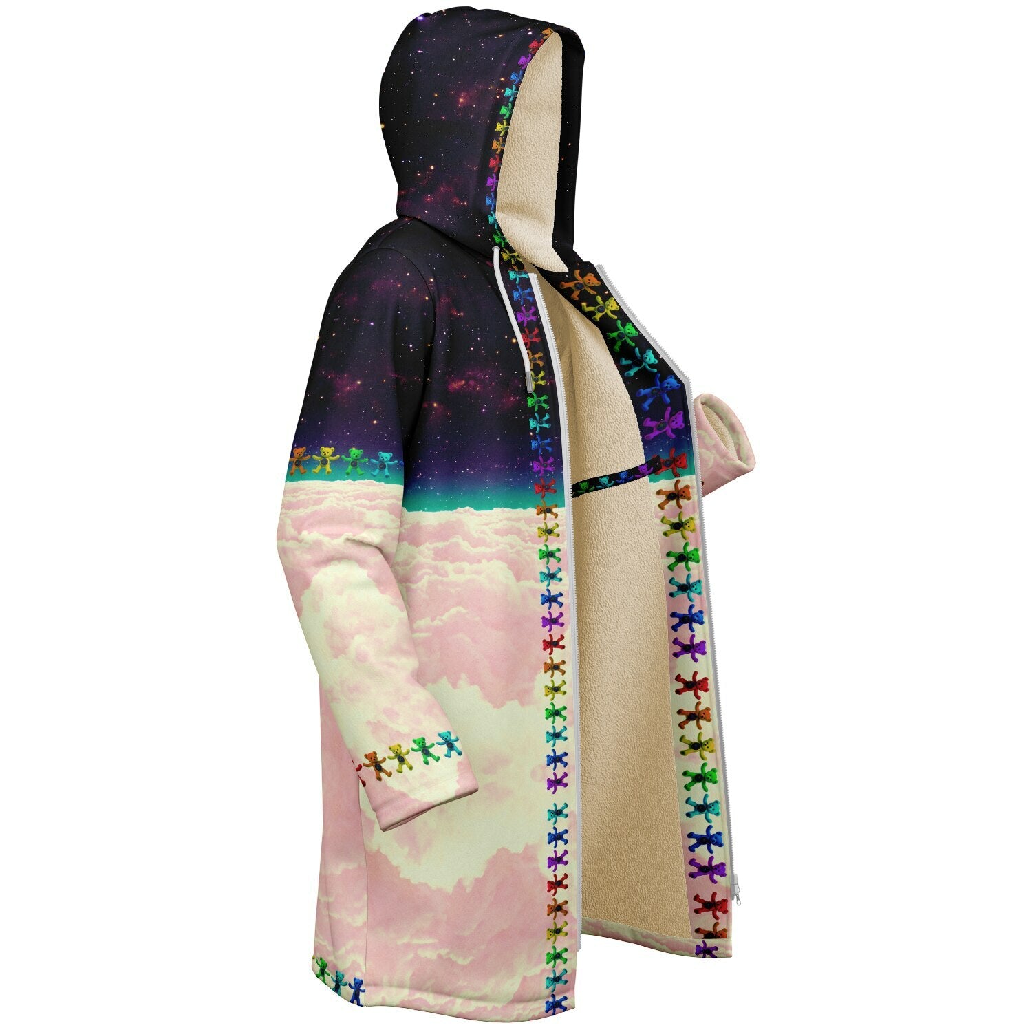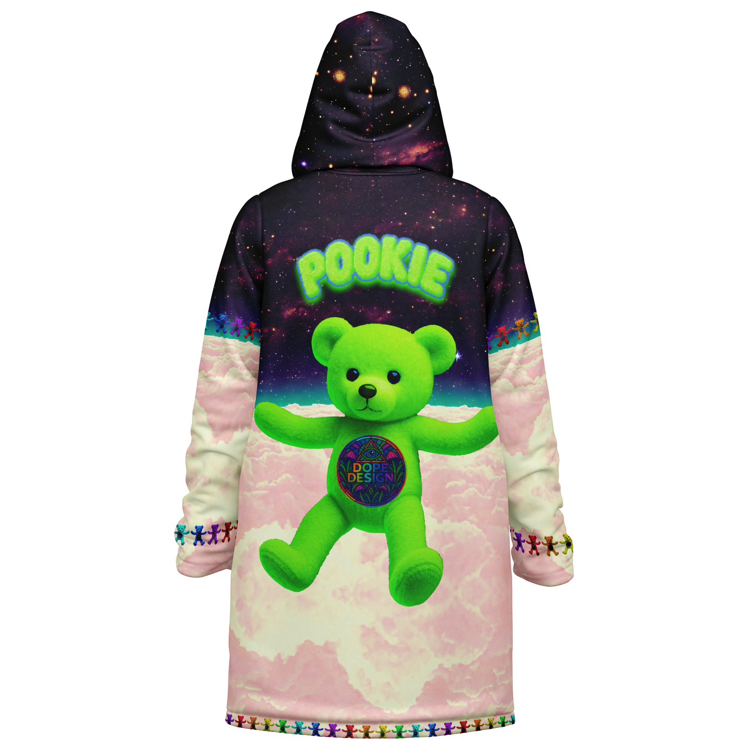 Step into a world of vibrant warmth and playful design with the Pookie Bear Cloak. This piece is a pure dose of serotonin, featuring a plush, nostalgic bear floating above candy colored clouds, encircled by a full rainbow of mini bears. The backdrop is a high definition, richly detailed galaxy that ensures this vibrant statement pops day and night with color that never fades.